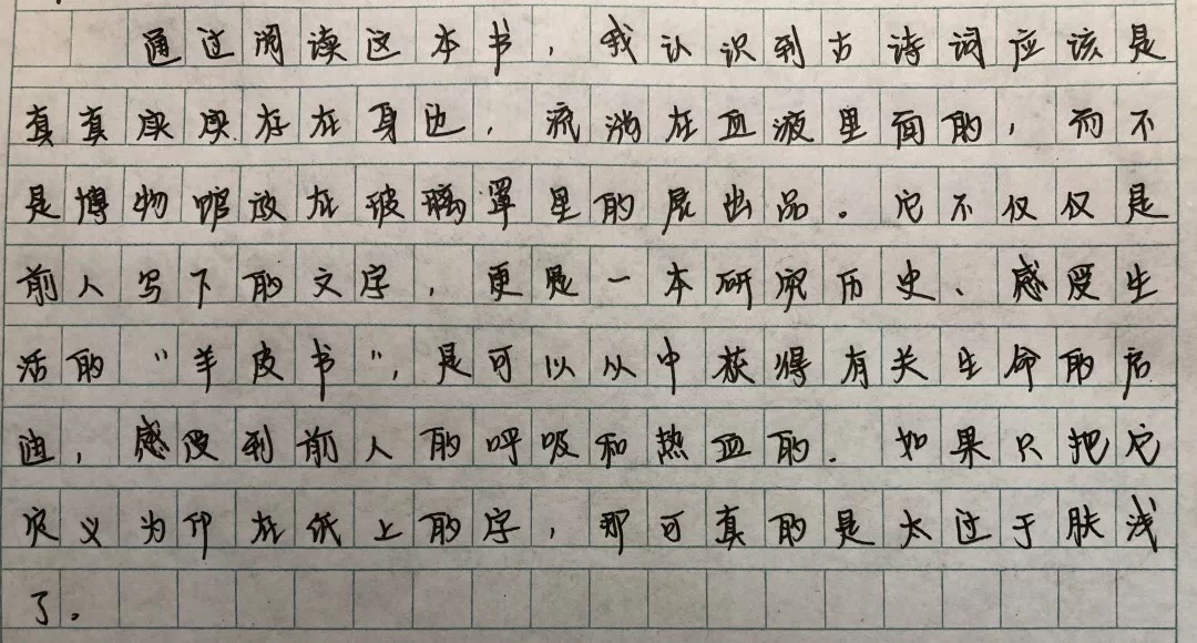 通过阅读这本书,我认识到古诗词应该是真真实实存在身边,流淌在血液里面的,而不是放在博物馆玻璃罩里的展出品。它不仅仅是前人写下的文字,更是历史。感受生活的“羊皮书”,是可以从中获得有关生命的启迪,感受到前人的呼吸和热血的。如果只把它定义为印在纸上的字,那可真的是太过于肤浅了。