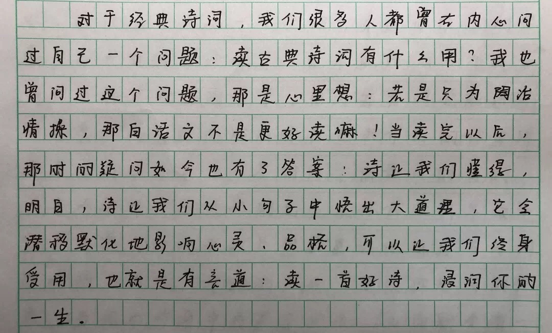 对于经典诗词,我们很多人都曾在内心问过自己一个问题:读古典诗词有什么用?我也曾问过这个问题,那时心里想:若是只为陶冶情操,那白话文不是更好读嘛!当读完以后,那时的疑问如今也有了答案:诗让我们懂得,明白什么叫文字之美,诗让我们从小句子中悟出大道理,它会潜移默化地影响心灵,品格,可以让我们终身受用。有言道:读一首好诗,浸润你的一生。
