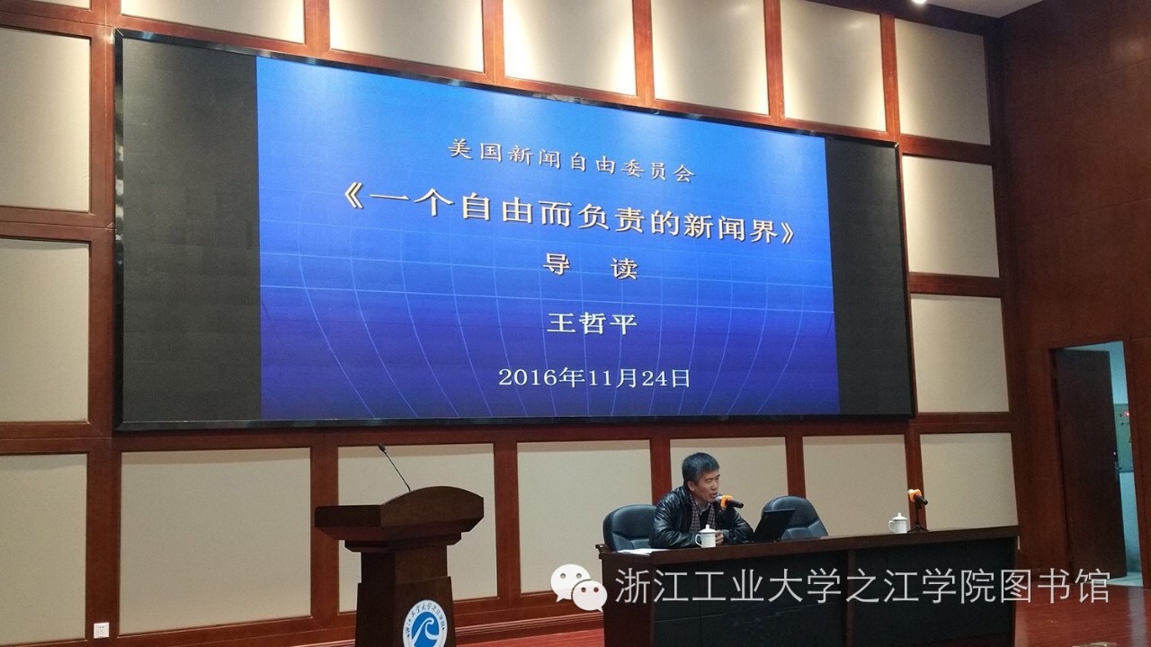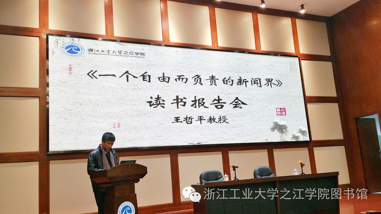11月24日,浙江工业大学人文学院党委书记王哲平教授所做的《一个自由而负责的新闻界》读书报告会在行健楼117礼堂顺利举行,来自全院各个专业200多名师生参加了这场读书报告会。
